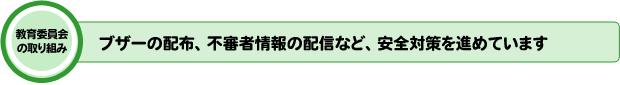 各学校では防犯ブザーの使い方や危険を避ける方法などを指導するほか、通学路の安全点検と安全マップづくり、複数下校、地域による見守り体制づくりなどを進めています。また、学校便りや「e学校ネット」により保護者や地域に情報提供をしています。 |