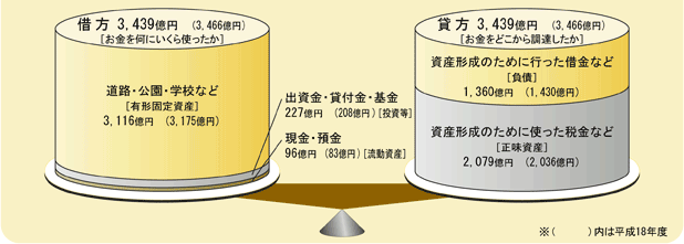 | バランスシートとは、左側「資産の部」と右側「負債の部」「正味資産の部」のバランスが常に保たれていることからこう呼ばれています。今までに整備してきた施設(道路や建物など)を左側(借方)に、その整備のために借り入れたお金などを右側(貸方)に一覧表示したものです。 |