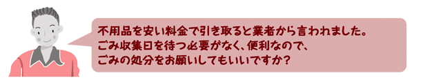家庭ごみを収集運搬するためには、一般廃棄物収集運搬業の許可が必要です(ただし、金属や紙など再生物を専門に扱う業者は除きます)。業者がこの許可を持っているかを確認してください。処分を依頼したら、業者の名称や連絡先が入った領収証などを受け取るようにするとともに、ごみがどのように処理されるのか、業者によく確認してください。 |