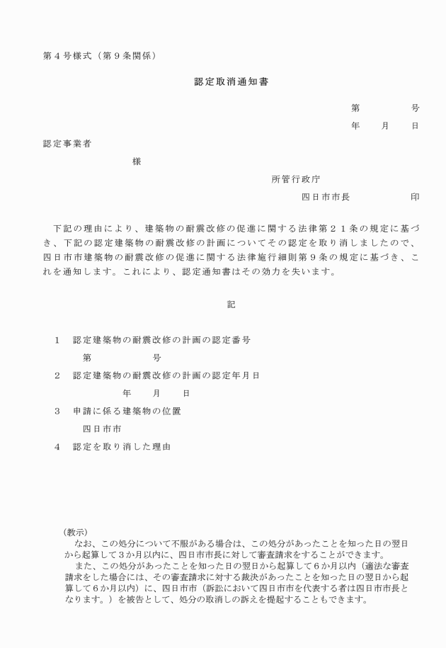 第9条 市長は、法第21条の規定により耐震改修計画の認定を取り消したときは、当該取消しを受けた者に対し、認定取消通知書(第4号様式)によりその旨及びその理由を通知するものとする。