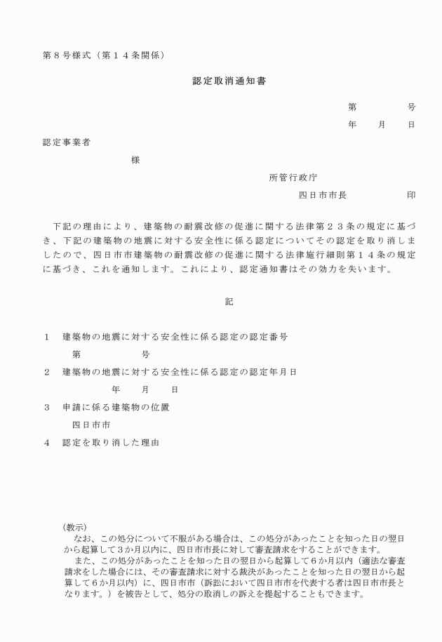 (建築物の地震に対する安全性に係る認定の取消し通知)