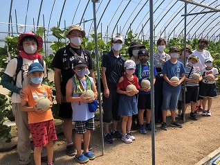 親子体験教室の第3回目が8月8日に開催され、8組の親子が参加しました。メロンの収穫方法や収穫後の調整方法の説明後、ビニールハウス内のメロンを親子で収穫しました。収穫後は、実に付いている枝がT字になるよう余分な葉や枝を切り落とし、綺麗になるよう一所懸命に磨きました。重さを計ってみると、2kgを超えるものもあり、大きさにびっくりでした。大事そうに抱きかかえている姿が印象的でした。