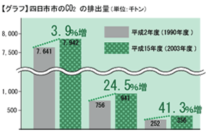 | 四日市市全体のCO2排出量は、平成15年度現在、平成2年度に比べて、全体の8割を占める産業分野で約4%増、1割を占める運輸分野で約25%増、家庭では40%を超えるなど、すべての分野で増加傾向(グラフ)にあり、対策が求められています。 |