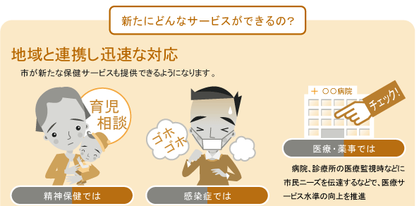 | 現在、市民の健康を守るための施策は県と市の分担で行われ、県が保健所の対人、対物保健サービスを、市が母子から高齢者までの健康診査、健康相談、健康増進、疾病予防などの対人保健サービスをそれぞれ担っています。一方、近年、少子高齢化、生活習慣病の増加、食の安全など保健衛生行政に対する市民ニーズが多様化しています。そこで、市では、保健所政令市へ移行し、より市民に身近なところで、きめ細かい保健サービスを総合的に提供していきたいと考えています。 |
