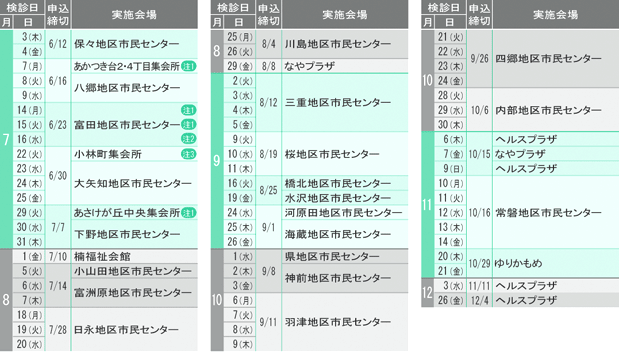 注1の日程は、乳がん検診は実施しません 注2の日程は、乳がん検診のみの実施となります 注3の日程は、子宮頚がん・乳がん検診のみの実施となります