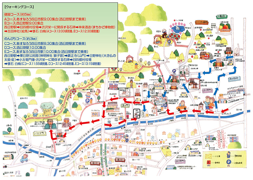 西日野駅→東日野公民館(神明神社 獅子頭)→顕正寺(山門)→日野神社(大念仏の太鼓・鉦)→小左衛門像・渋沢栄一に関係する石碑→旧四郷村役場→懐石 白梅(Cコース11:55頃到着、Dコース12:45頃到着、Eコース13:15頃到着)