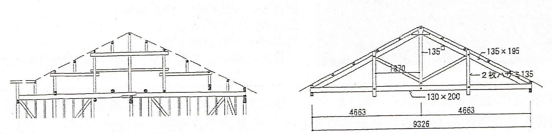 和小屋とは、梁に束を立てて屋根を支える屋根構造で、水平荷重に限界があるため、大きな部屋よりも小さな部屋をつくるのに適しています。一方洋小屋は、部材を三角形状に組み合わせて合掌により梁を持ち上げているので、大きな部屋をつくるのに適しています。旧四郷村役場は、主屋と主屋袖でふたつの異なる組み方で造られているところに特徴があります。