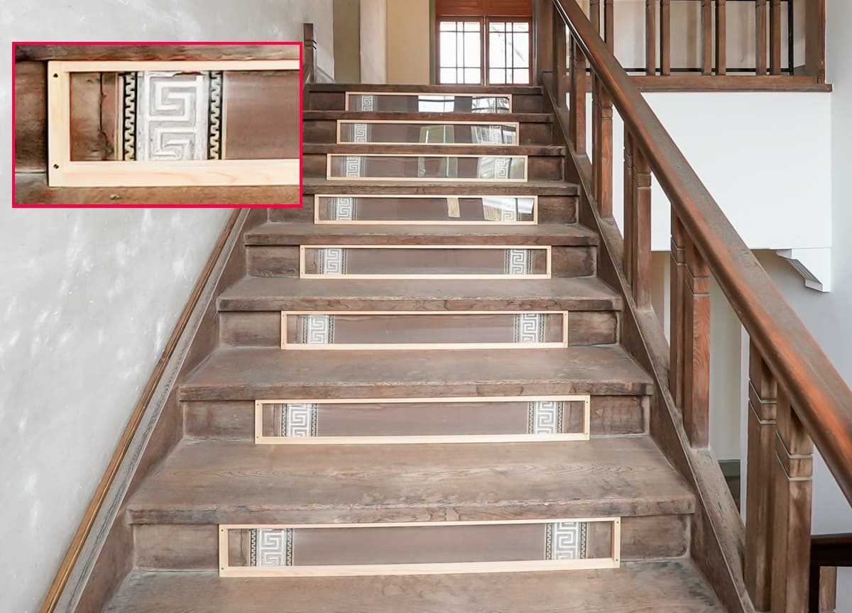 リノリウムとは、(コーヒー豆が入っているような)麻布に亜麻仁油などの植物性の油を塗って作られた内装(カーペットのようなもの)です。国会議事堂など、貴賓室があるようなところに敷かれていて、ここ旧四郷村役場の中央階段にも敷かれていました。旧四郷村役場には当時のものが現存しており、非常に貴重です。