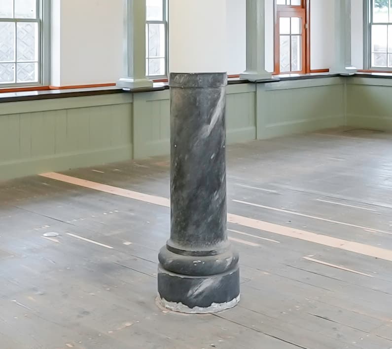 1階旧事務室に立つ円柱は、設計図にはかかれていませんでしたが、基礎の状況からみて、建設当初から存在していたと考えられます。当時の左官屋が、大理石をイメージして墨汁を使って描いたマーブル模様で、擬石塗と言われています。当時の左官屋が全員できたわけではなく、限られた技術者のみが使える技法でした。
