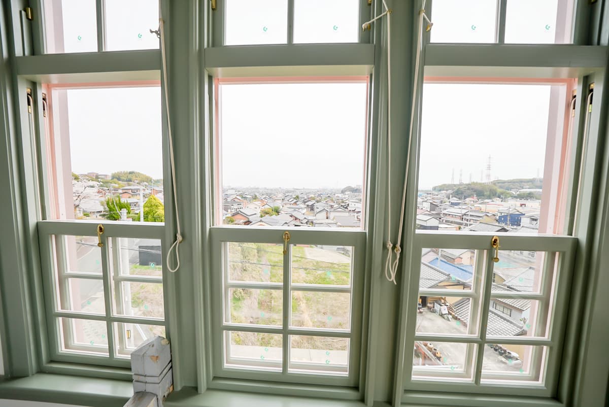 旧四郷村役場の外壁にとりつく窓のほとんどは、窓袖柱に分銅が入り、分銅と窓とが釣り合うことにより、留め金を使わなくても開閉状態を自由にできるよう施されています。