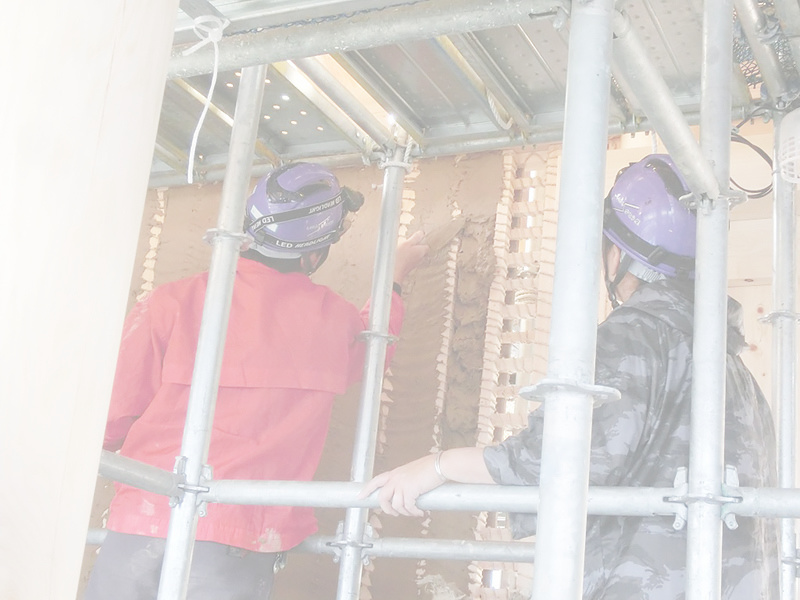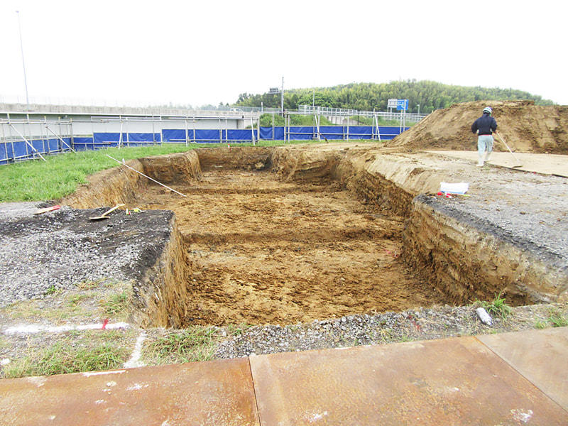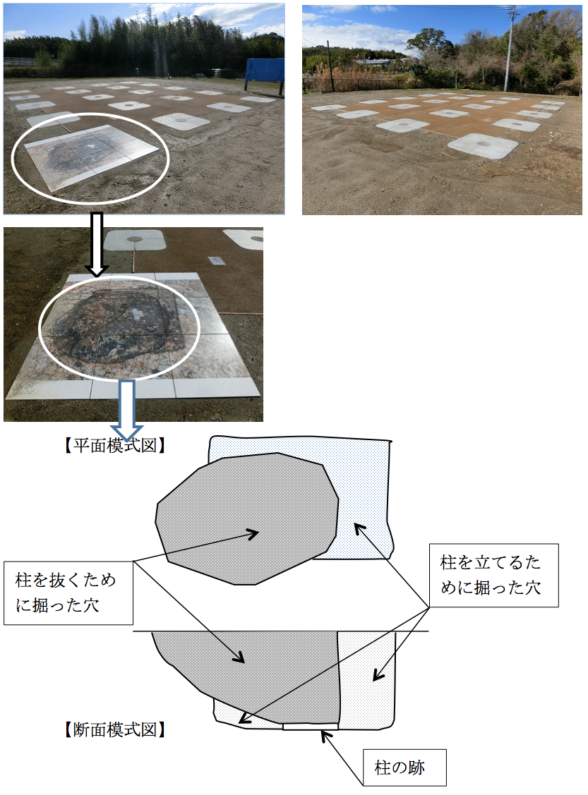 1箇所の柱跡だけは、陶板に発掘調査の時の写真を原寸大に焼き付けて、柱穴がみつかったときの状況を見られるようにしています。