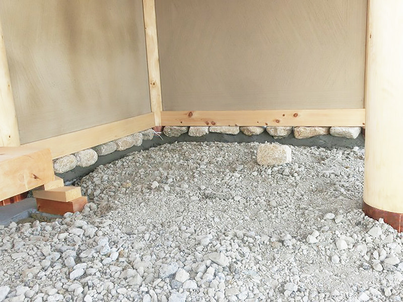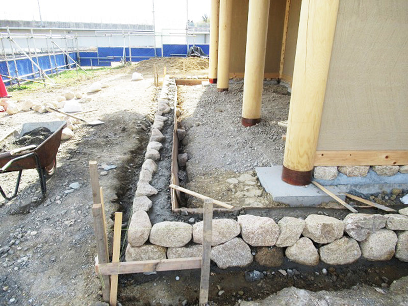 倉跡の真上に、石と舗装により模式的に建物の位置を表示しています。白い石の中に、茶色い石で丸く表示しているのは、柱を立てるために掘った穴と柱です。舗装した4×5間の柱跡の範囲が、倉の床の範囲です。