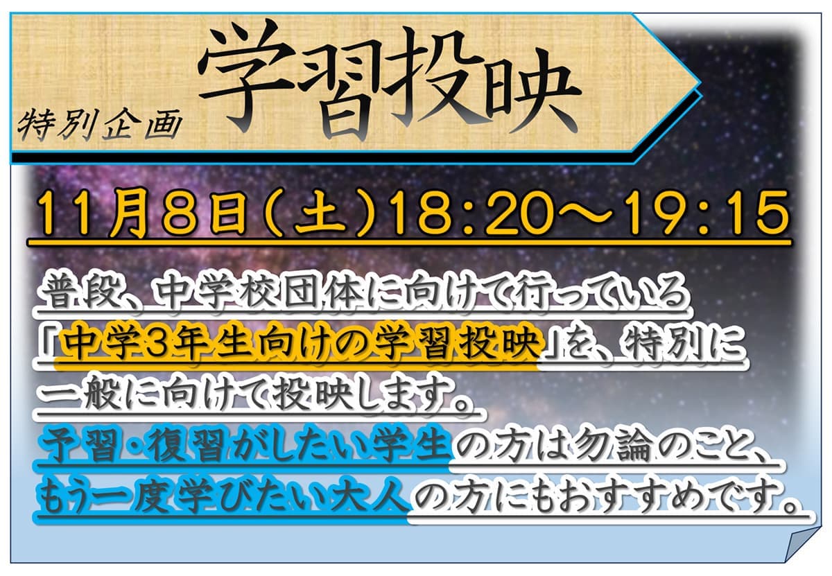 普段、中学校団体に向けて行っている「中学3年生向けの学習投映を、特別に一般に向けて投映します。