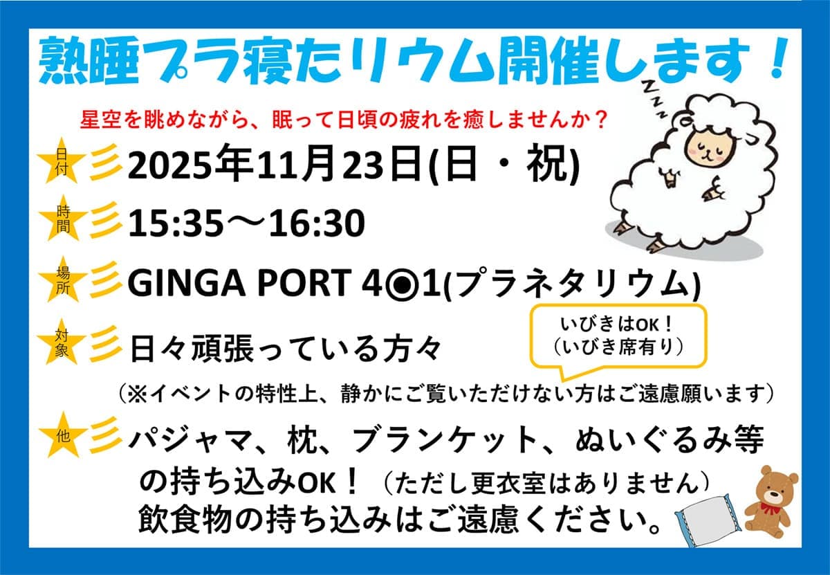 | 熟睡プラ寝たリウム | 11月23日(日・祝) 15:35~16:30 |