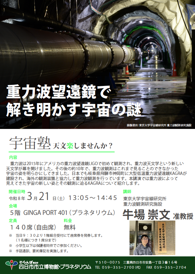 | 重力波望遠鏡で解き明かす宇宙の謎 | 2026年3月21日(土) 13:05~14:45 |