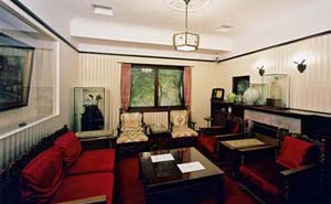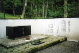 再現された丹羽邸玄関部分【上】と文学者の墓【下】