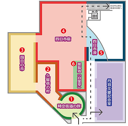 時空街道では、四日市の原始・古代から江戸時代までの歴史を扱っています。明治時代から現代までの四日市のあゆみは、2階の四日市公害と環境未来館でご覧ください。両館を合わせてご覧いただくことで、原始・古代から現代までの四日市のあゆみを、一つの流れとしてご覧いただけます。