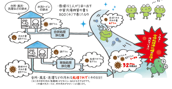単独処理浄化槽や汲取便槽をご使用のお宅は、お風呂や台所などの生活雑排水が処理されず、そのまま公共用水域に流れています。全ての生活排水を処理できる合併処理浄化槽に転換していただきますようお願いいたします。