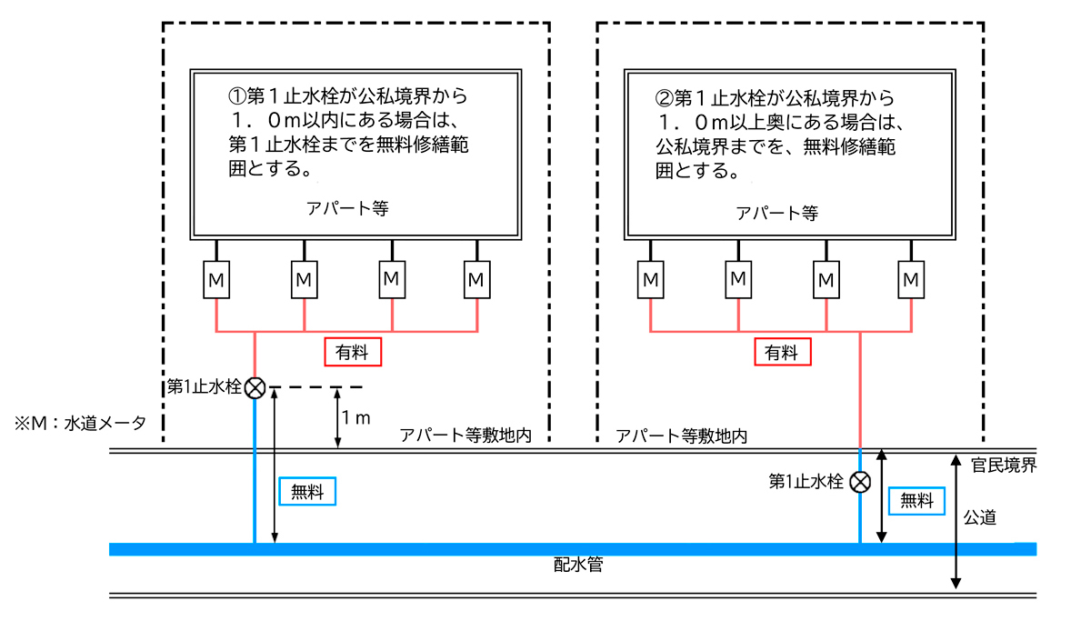 ※ただし、宅内の第1止水栓の位置が官民境界から1メートルより奥に設置されている場合は、配水管から官民境界までが上下水道局が行う無料修繕の範囲となります。詳しくは、下記へお問合せください。