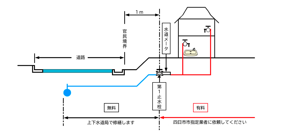 配水管から第1止水栓までは、上下水道局で修繕します。※