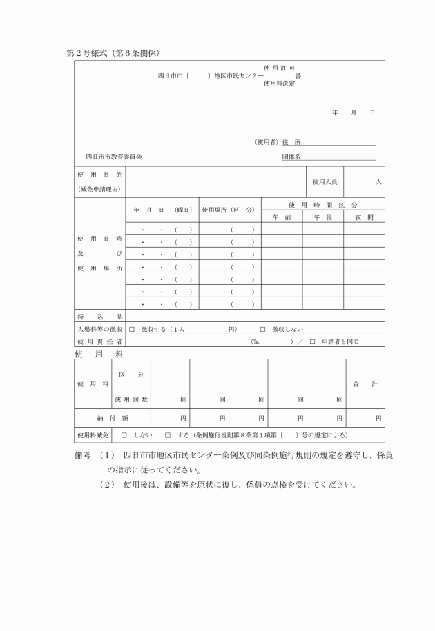 第7条 使用者は、使用許可書に記載された事項(使用日、使用時間区分、使用施設、使用目的及び入場料等の徴収に関するものを除く。)を変更し、又は施設等の使用を取り消そうとするときは、四日市市〔 〕地区市民センター使用変更(取消)・使用料還付申請書(第3号様式。以下「変更・還付申請書」という。)に使用許可書を添えて、委員会に申請しなければならない。