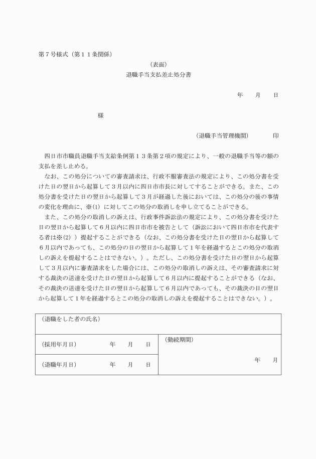 第1条 この規則は、四日市市職員退職手当支給条例(昭和31年四日市市条例第7号。以下「条例」という。)第21条の規定に基づき条例の実施に関し必要な事項を定めることを目的とする。