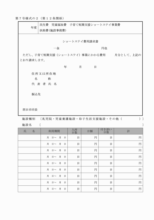 ○四日市市子育て短期支援(ショートステイ)事業実施要綱