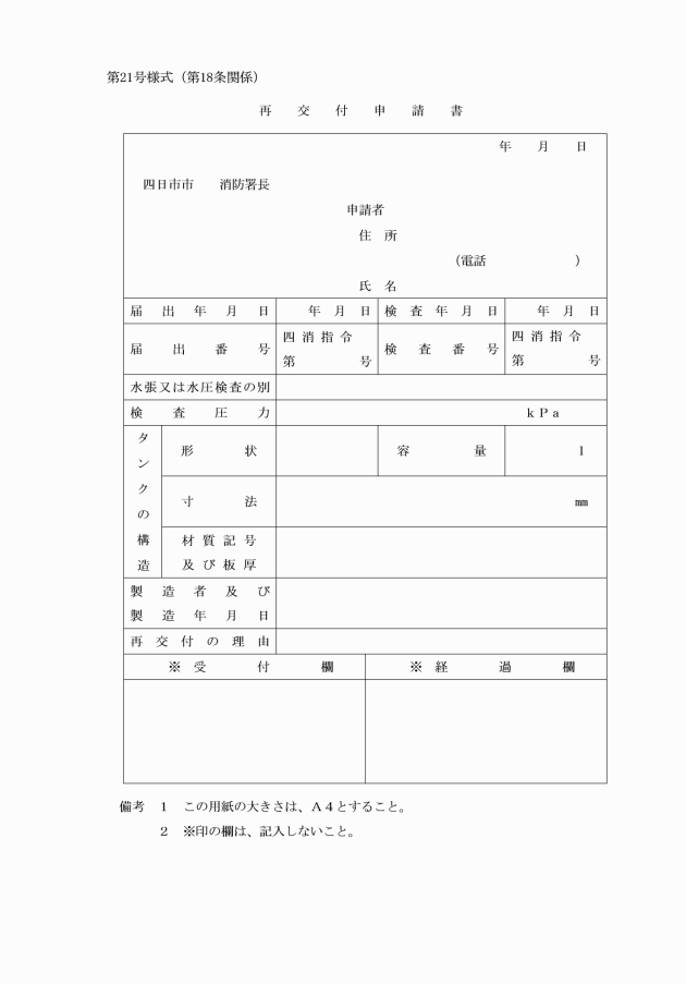 第18条 検査済証の交付を受けた者が、当該検査済証を亡失し、汚損し、又は破損したときは、再交付申請書(第21号様式)により、理由書を添えて消防署長に再交付の申請を行い、その再交付を受けることができるものとする。