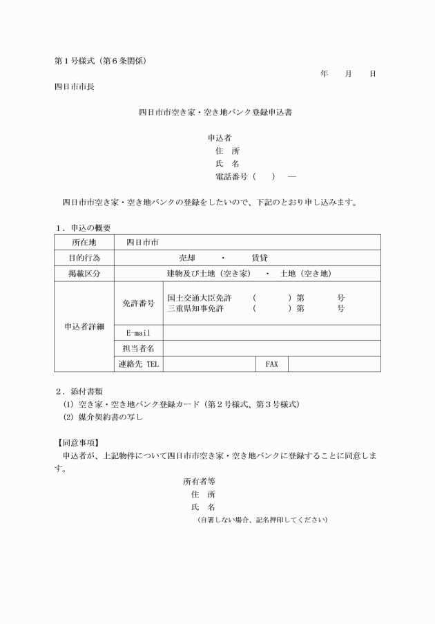 第5条 空き家・空き地バンクに登録することができる者(以下「申込者」という。)は、登録する空き家、空き地について、所有者等と専任媒介契約若しくは専属専任媒介契約を締結した宅地建物取引業者とする。