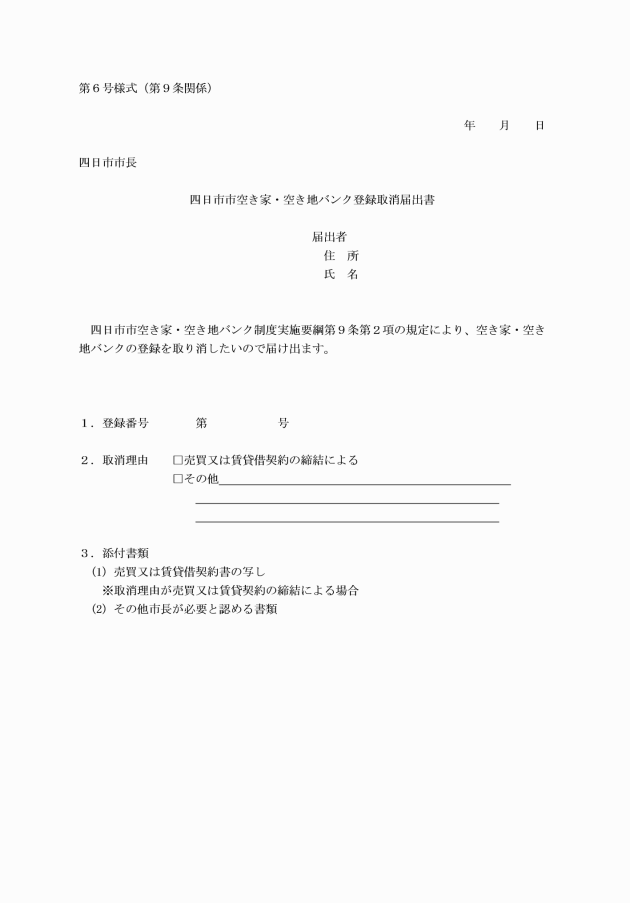2 登録者は、登録事項の変更のうち、次のいずれかに該当するときは、四日市市空き家・空き地バンク登録取消申出書(第6号様式)を提出しなければならない。