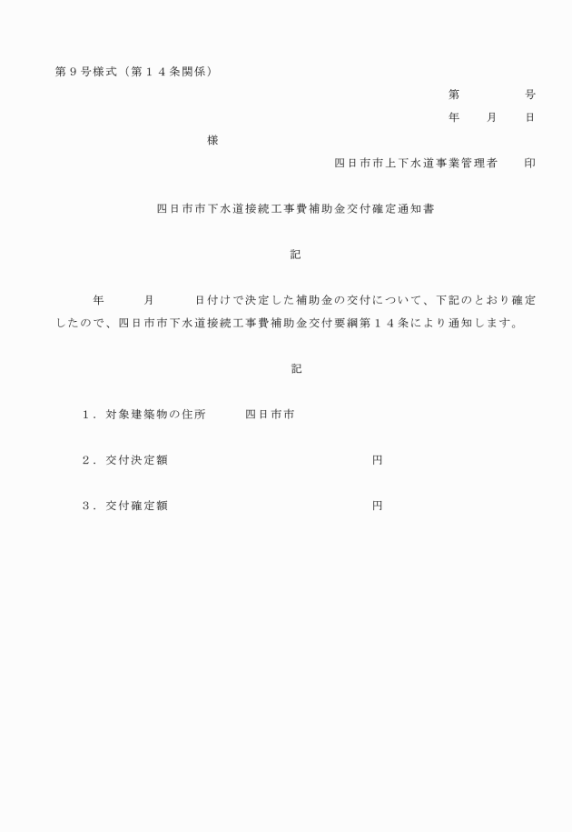 第10条 決定者は、水洗化工事の内容、経費その他事項の変更(軽微な変更を除く。)をしようとするとき又は水洗化工事を中止しようとするときは、あらかじめ四日市市下水道接続工事費補助金変更交付申請書(第6号様式)にその内容が確認できる必要書類を添付し、管理者に提出しなければならない。