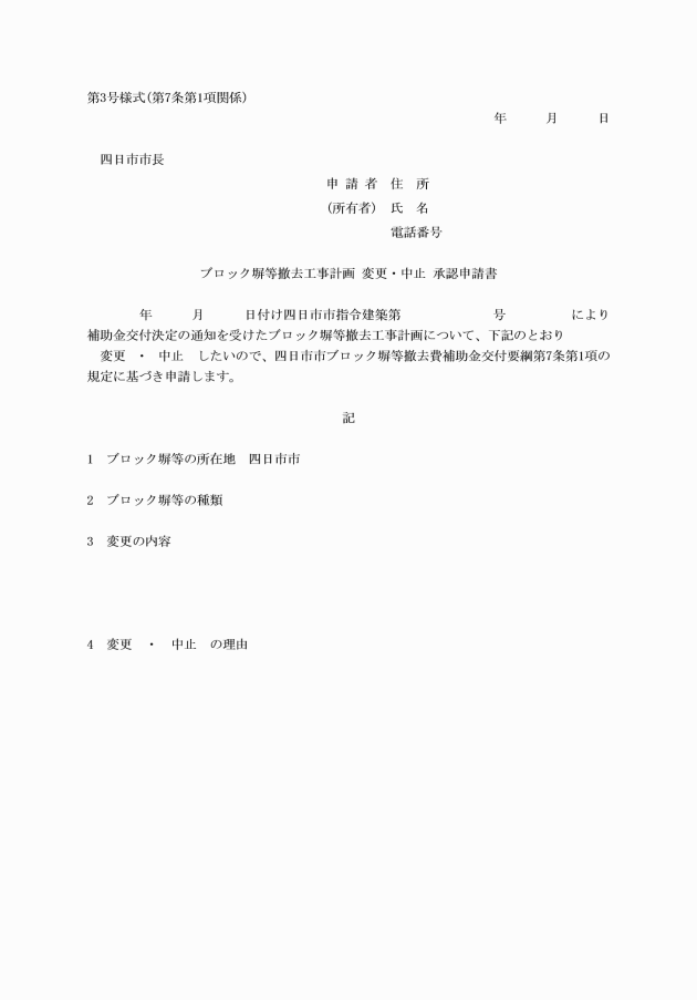 第7条 申請者は、申請内容を変更しようとするとき(軽微な変更を除く。)又は工事を中止しようとするときは、あらかじめブロック塀等撤去工事計画変更・中止承認申請書(第3号様式)に別に定める関係書類を添付して市長に提出しなければならない。