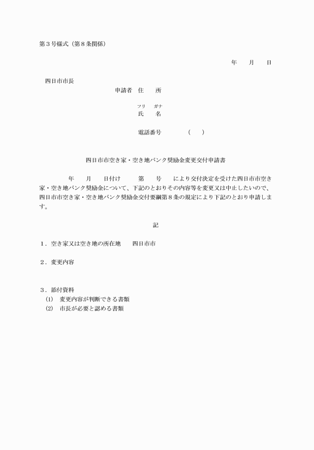 第8条 奨励金の交付決定を受けた者(以下「決定者」という。)が交付申請の内容を変更又は中止しようとするときは、あらかじめ四日市市空き家・空き地バンク登録奨励金変更交付申請書(第3号様式)にその内容が確認できる必要書類を添えて市長に提出しなければならない。