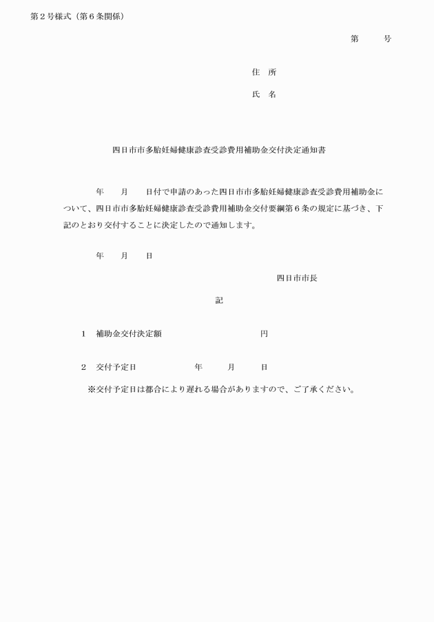 第5条 補助金の交付を受けようとする者は、四日市市多胎妊婦健康診査受診費用補助金交付申請書(第1号様式)に受診費用の領収書原本、妊婦一般健康診査受診済証(母子健康手帳の「妊娠中の経過」ページのコピーなど)、多胎妊娠であることが確認できるもの(母子健康手帳の「出産の状態」ページのコピーなど)その他市長が必要と認めた書類を添付して、市長に申請しなければならない。