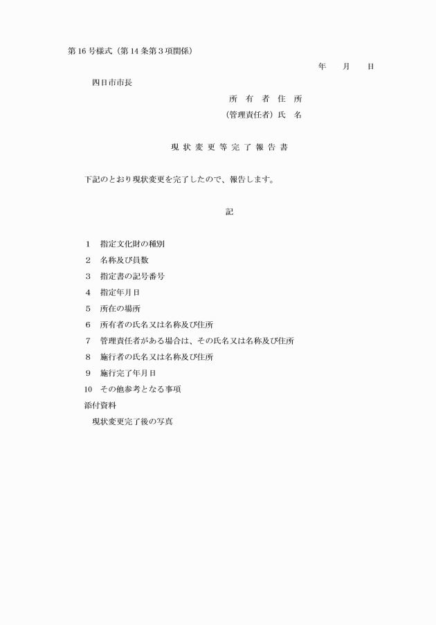 3 許可申請者は、当該許可に係る現状の変更等が完了したときは、速やかに現状変更等完了報告書(第16号様式)を市長に提出しなければならない。
