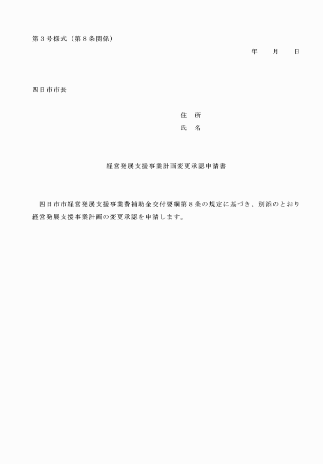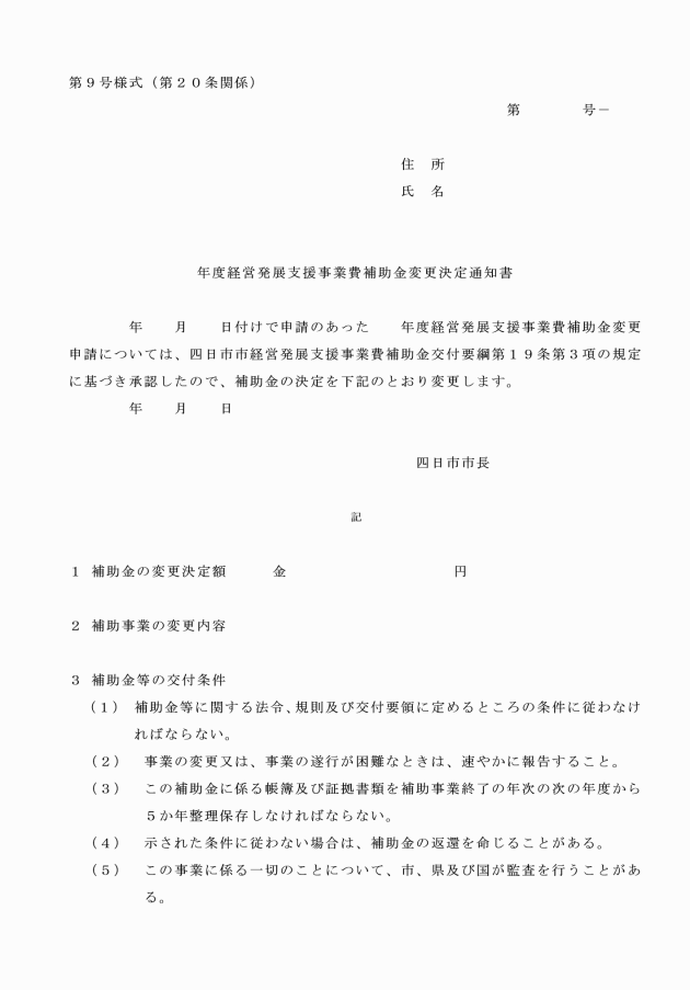 第19条 補助事業者が補助金の交付決定通知を受けた後において補助事業等の内容の変更(補助事業の完了後における成果物の変更を含み、市長の定める軽微な変更を除く。)をする場合又は補助事業等を中止し、若しくは廃止しようとする場合は、直ちに市長に経営発展支援事業費補助金変更承認申請書(第8号様式)を提出し、市長の承認を受けなければならない。
