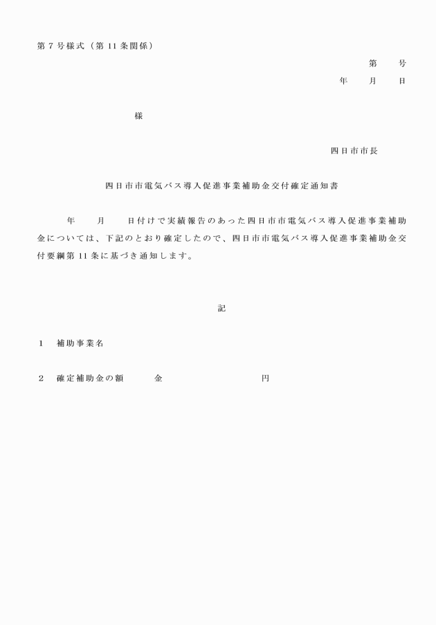 第6条 補助金の交付を受けようとする補助対象事業者は、補助対象自動車が初度登録される前及び補助対象経費の支払いに着手する前までに、四日市市電気バス導入促進事業補助金交付申請書(第1号様式)に必要な書類を添付して市長に提出しなければならない。なお、原則として、国補助事業に係る申請等を行ったのちに交付申請を行うこと。