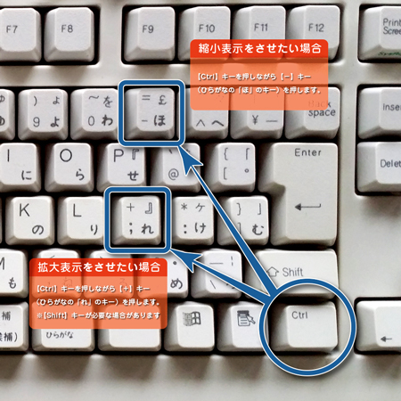 【表示を拡大したい場合】〇キーボードの【Ctrl】キーを押しながら【+】を押しますと10%ずつ拡大します。【拡大した表示を縮小したい場合】 〇キーボードの【Ctrl】キーを押しながら【-】を押しますと10%ずつ縮小します。