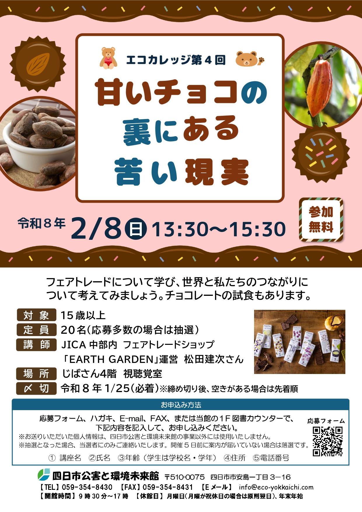 エコカレッジ4 甘いチョコの裏にある苦い現実 フェアトレードについて学び、世界と私たちのつながりについて考えてみましょう。チョコレートの試食もあります。 対象 15歳以上 定員 20名 講師 JICA 中部内 フェアトレードショップ 「EARTH GARDEN」運営 松田建次さん 場所 じばさん4階 視聴覚室 締切 1月25日 |